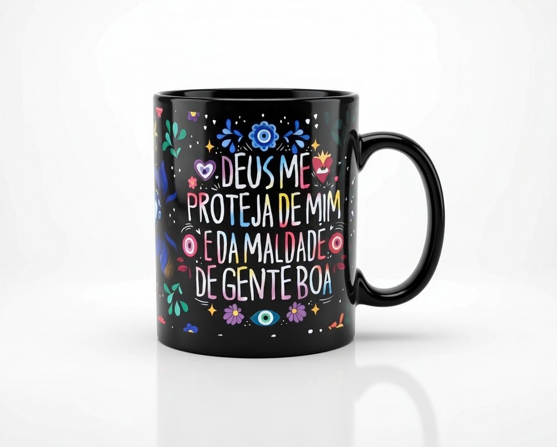 Caneca de porcelana preta para presentear ou para uso pessoal com muito estilo e personalidade.